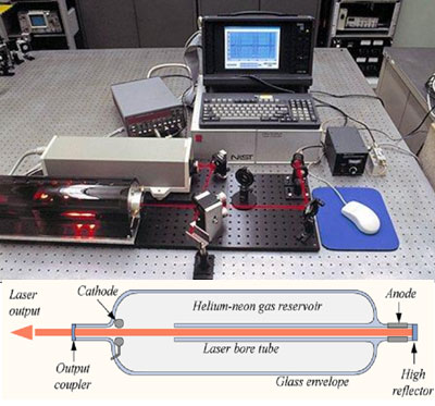 Keterangan gambar: Satu meter adalah jarak yang ditempuh Iodine Stabilized Helium-Neon Laser didalam ruang hampa (yang memiliki kecepatan 299.792.458 meter/detik, selama 1/299.792.458 detik (sumber gambar: dokumen KIM LIPI Serpong).