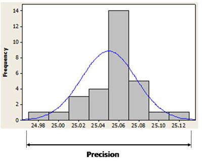 Anda lihat pada garis biru di atas, adalah pendekatan garis distribusi normal dari data hasil pengukuran. Rentang jarak antara ujung lembah dari diagram distribusi normal tersebut adalah cara kita mengenali tingkat kepresisian (precision) sebuah alat ukur. Dari data pengukuran yang ada, bila kita kemudian membuat pendekatan diagram diatas, maka semakin kecil jarak lebar precision, alat ukur dikatakan memiliki kepresisian lebih baik. Keberulangan (repeatability) pengukuran lebih baik.