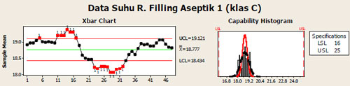 Data suhu diatas diambil setiap 30 menit, sehingga dalam sehari didapat 48 data. Diukur selama 5 hari, dimana setiap data pada waktu yang sama dirata-rata. Di grafik control-chart hasil rata-rata tiap waktu selama 5 hari, kita bisa menganalisa sehingga mendapatkan angka rata-rata total, UCL (Upper Control Limit) dan LCL (Lower Control Limit) nya. Yang dalam hal ini diambil plus-minus 1x standar-deviasinya. Gambaran pergerakan suhu selama sehari penuh bisa memberi gambaran bagaimana pencapaian kinerja sistem HVAC. Akan lebih memberi jaminan, bila juga dilengkapi data pengukuran selain saat commissioning dan qualification sebagai syarat keberterimaan sistem, juga ada data saat puncak musim panas dan musim dingin, juga saat dimana ruang diperkirakan memiliki beban tertinggi (mesin bekerja penuh, kondisi orang terbanyak, dsb).