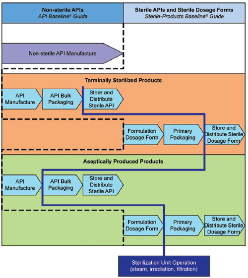 Warna coklat menunjukkan pilihan untuk Sterilisasi secara terminal, dan warna hijau untuk pilihan fasilitas Pengisian Aseptik. Sedang garis biru adalah batas dimana tahapan sterilisasi itu dilakukan. Artinya, tahapan setelah itu (dari garis biru ke kanan) adalah tahapan yang sudah harus dijamin produk obat yang dihasilkan adalah steril.